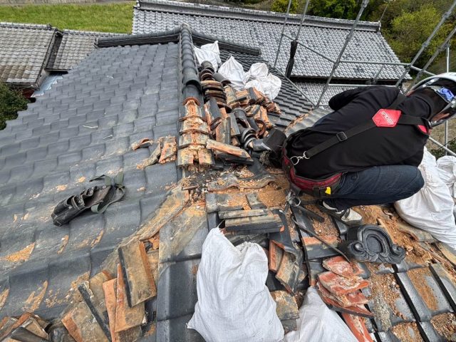 古くなった瓦と内部の葺き土(ふきつち)、そして崩れた漆喰を一度すべて取り外し、屋根の棟部分を一から整える工程に入ります。
