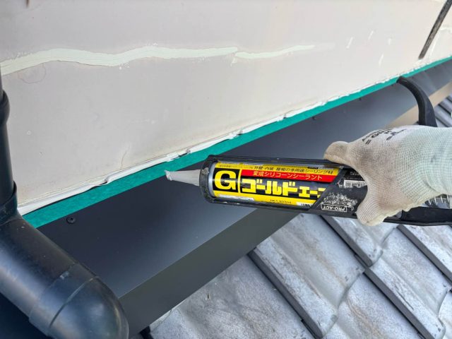板金と外壁が接する部分に、専用のコーキング材をたっぷりと充填していきます。