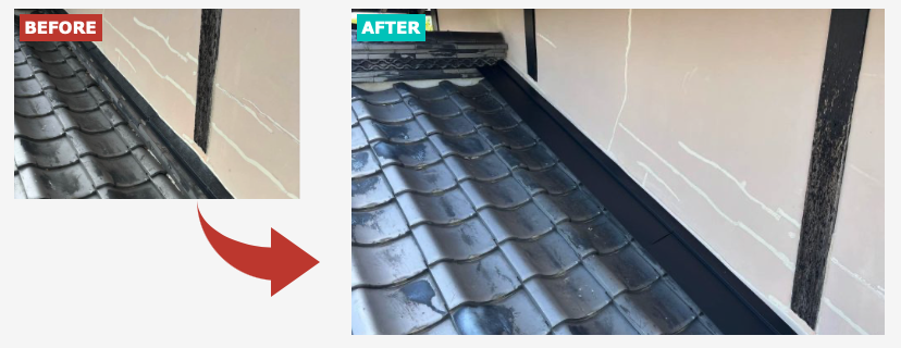 調査ブログでもお伝えした通り、瓦自体には割れがないものの、外壁を伝う雨水をブロックする「雨押え板金」が寿命を迎えていました。