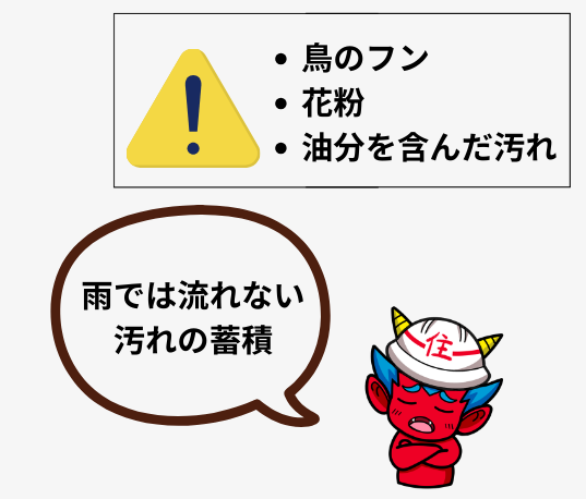 雨筋汚れの定着: 軽い埃は流れますが、鳥のフンや油分を含んだ汚れは、雨によって逆に「雨筋」として定着し、さらに汚れを呼び寄せます
