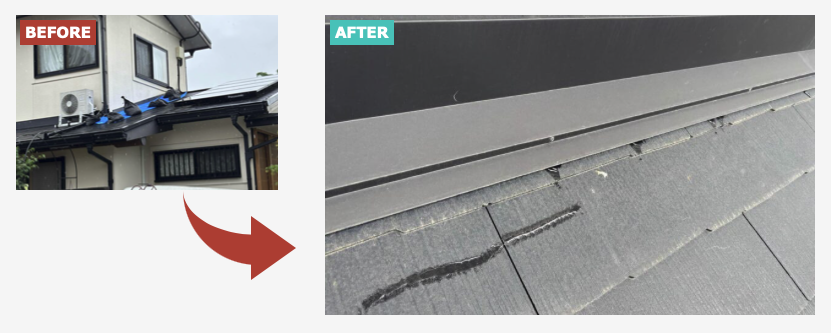 今回は、スレート(コロニアル)屋根において経年劣化が顕著だった破損箇所に対し、以下の二段構えでアプローチしました。