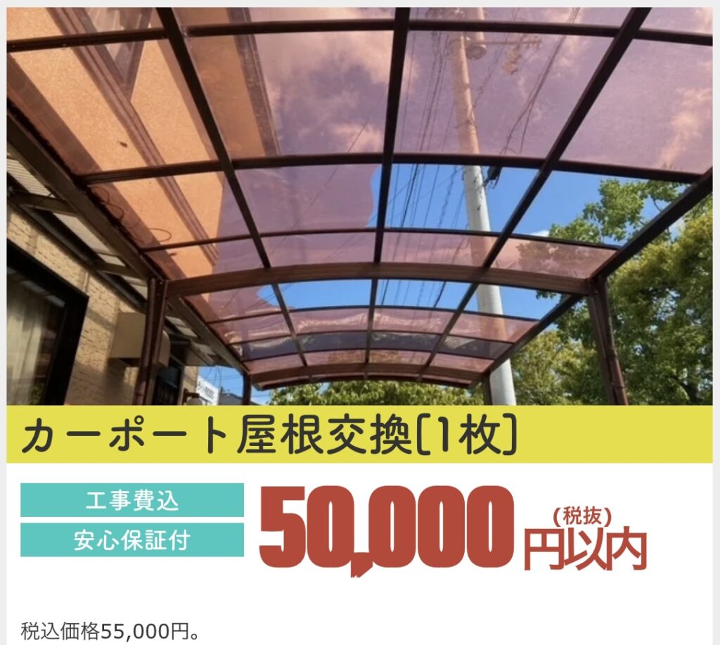 住みたかルーフでは、カーポートの部分交換も5万円以内の安心価格でお受けしています。