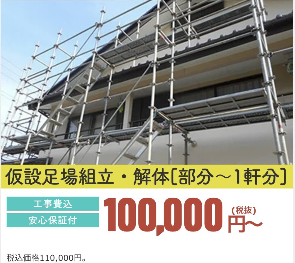 「安全な工事は、強固な足場から。10〜30万円で実現する『安心・安全の仮設足場プラン』。近隣への飛散防止ネットもセットで、丁寧かつ迅速に設置いたします!」