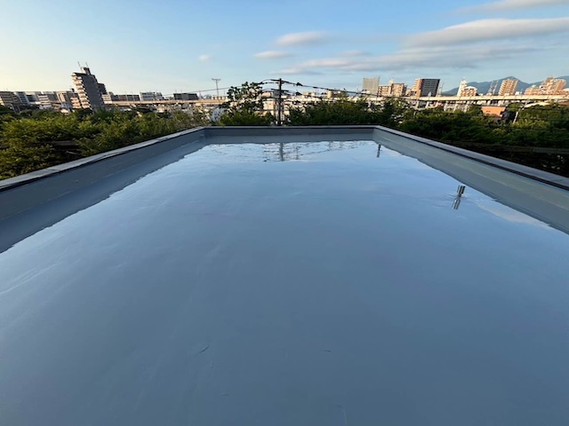 1層目のウレタン防水層をしっかりと乾燥させ、上から2層目を塗布していきます。1層目では不十分な防水膜の厚みを、2層目を塗布することで確保します。施工完了