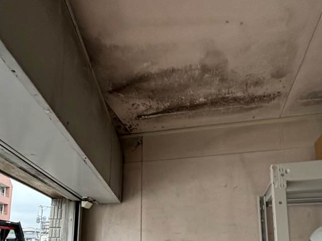 集中豪雨の日に「事務所1階の倉庫天井から雨漏りしている」とお客様よりご相談がございました。倉庫天井に雨染みが広がり、雨漏りが発生しています。