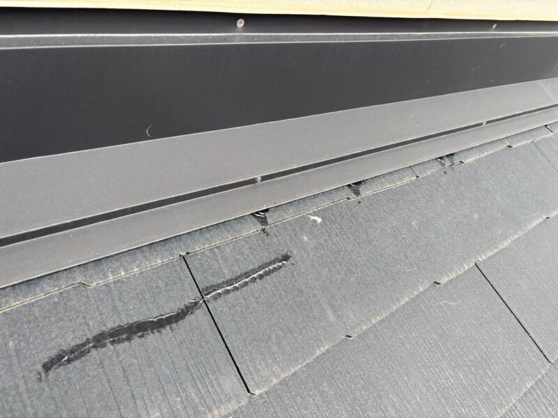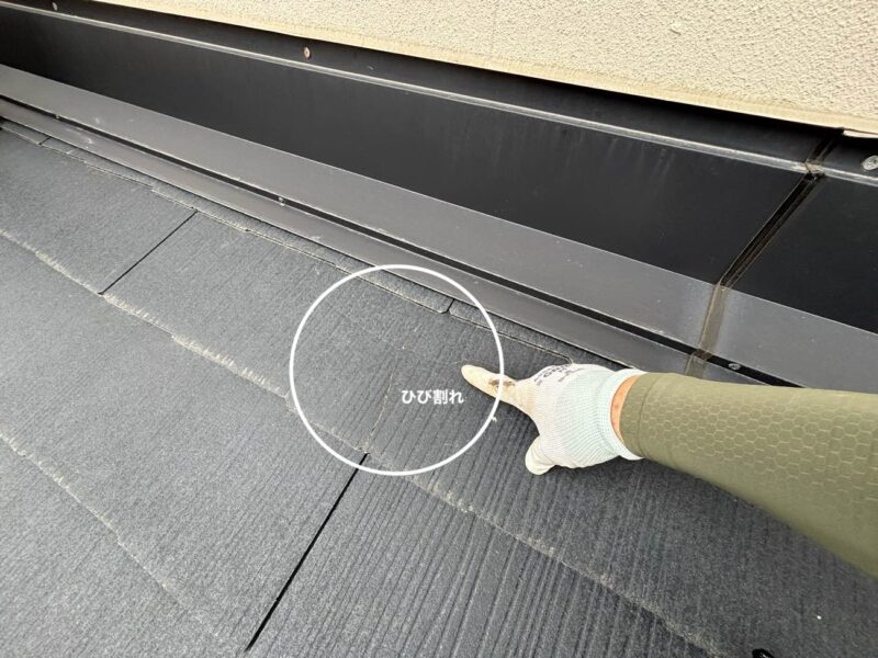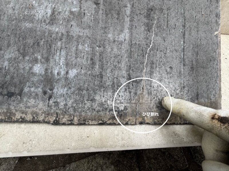 複数の屋根材にひび割れを発見しました。屋根材のひび割れた隙間から雨水が侵入した可能性が高いと判断しました。この状態を放置すると、屋根下地や構造体の腐食、さらには建物の耐震性の低下など重大な問題を引き起こします。