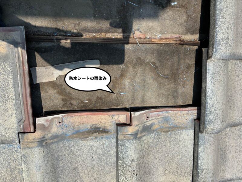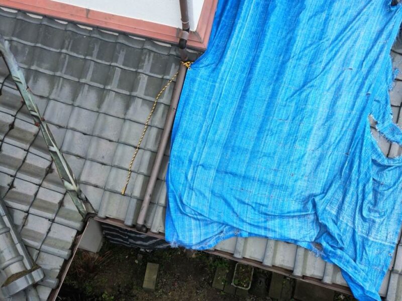 お客様より「雨漏りしているので見に来てほしい」とのご依頼がございました。早速現地へ伺うと、お客様ご自身がブルーシートを敷いて応急処置を行っていました。雨漏りしている箇所の瓦の下を確認すると、防水シートにまで雨水が侵入していました。