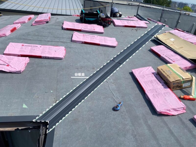 谷板金とは、屋根面が接合してできる「谷」の部分に設置される板金で、屋根の雨水を集めて排水を促す役割を担っています。