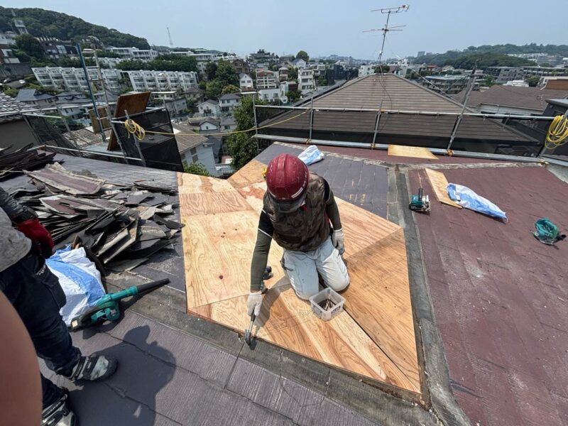 腐食した下地の補修を行い、既存の屋根の上から新しい屋根材を設置する屋根カバー工法を行うこととなりました。