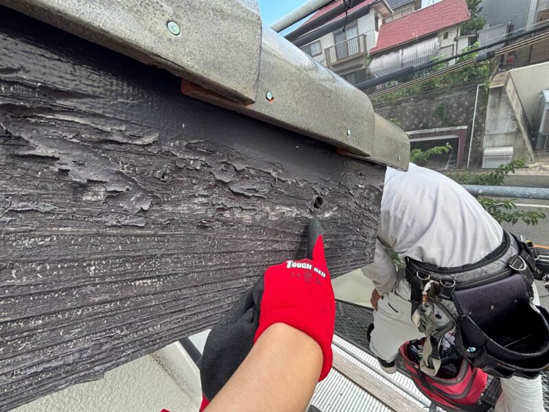 お客様より「破風板の劣化が気になる」との依頼がございました。3年前に塗装工事を行ったとのことですが、破風板の劣化が進行していました。