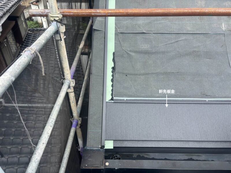 防水シートの敷設完了後、軒先板金を取り付けていきます。
