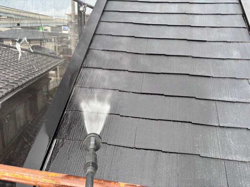 まず最初に、既存屋根の高圧洗浄を行い、屋根に付着した汚れを落としていきます。