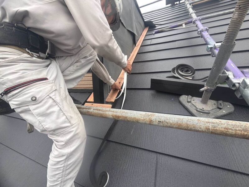 防水シートの敷設完了後、軒先板金を取り付けていきます。