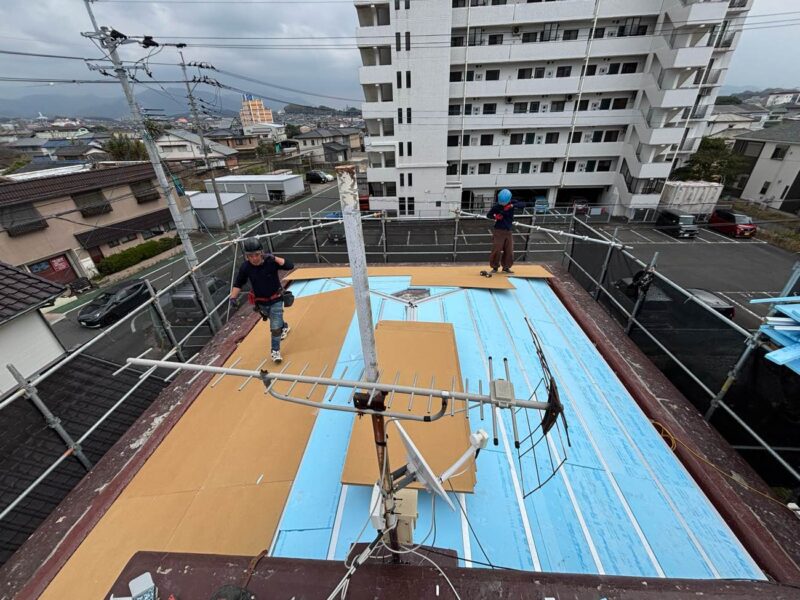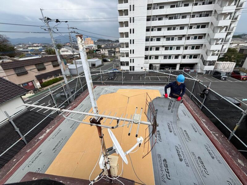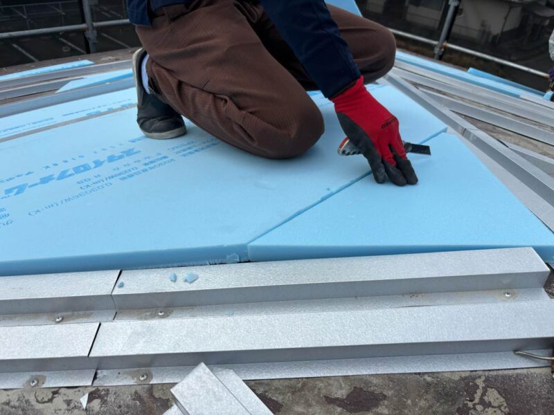 下地調整後、既存屋根の上に断熱材を敷いていきます。