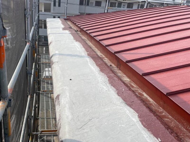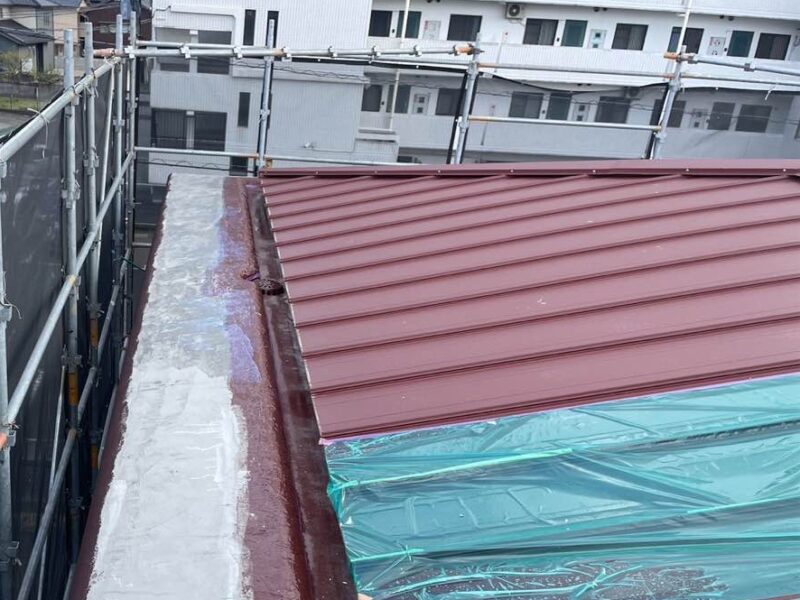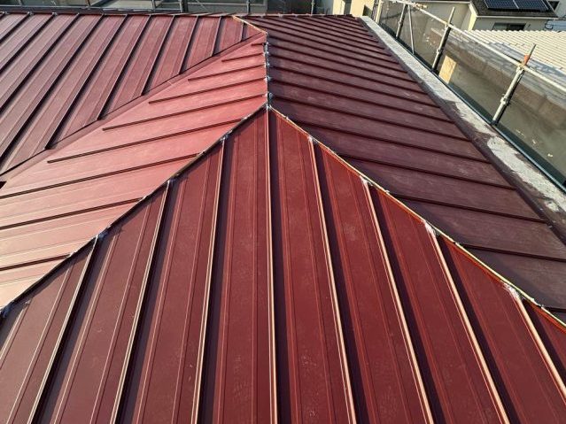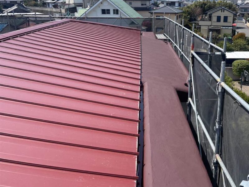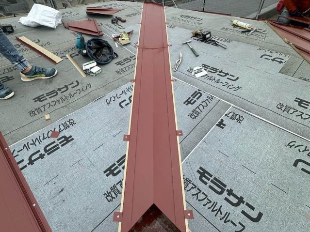 屋根の頂上部分に棟板金を取り付け、施工完了。