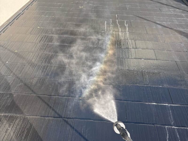 まず初めに、屋根の高圧洗浄を行い、屋根表面に付着した汚れや、カビ・苔などをしっかりと落とします。