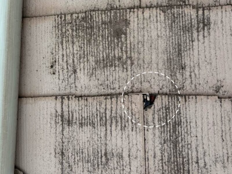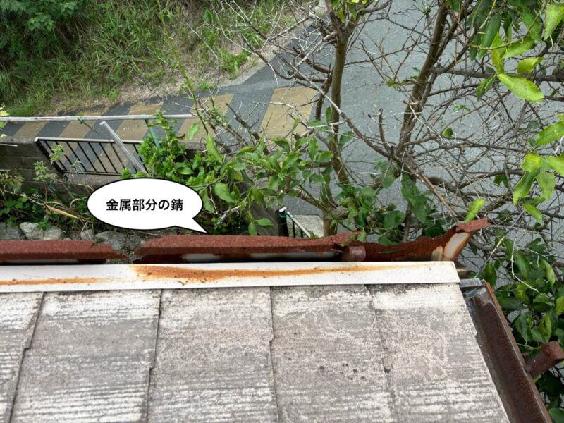 屋根の端部を守る金属パーツ(板金)は、形が崩れるほど錆が進行していました。固定力が低下しているため、台風などの強風時に板金が剥がれて飛散する二次被害のリスクがあります。