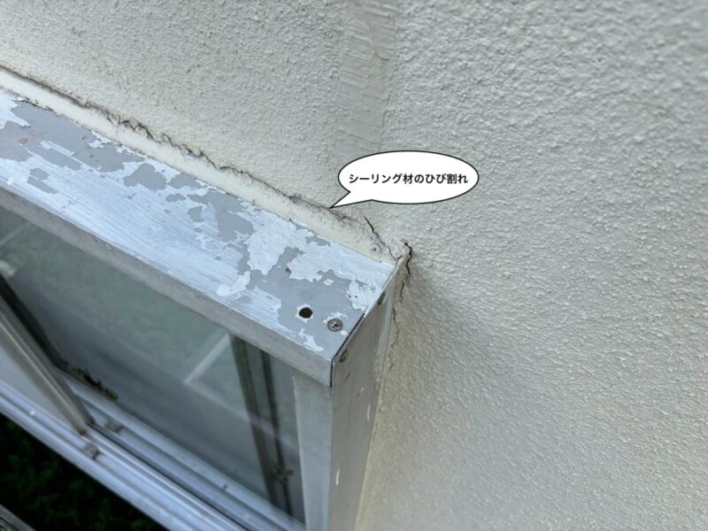 調査の結果、窓枠上部のシーリング材(防水材)に割れが見つかりました。この隙間から雨水が壁内部へダイレクトに侵入しており、窓枠の雨染みとなって現れていました。