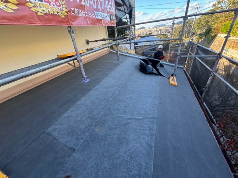 既存の屋根の上から、新しい防水シートを全面に隙間なく敷き詰めます。しわや空気が入らないよう、職人が手作業で密着させていきます。