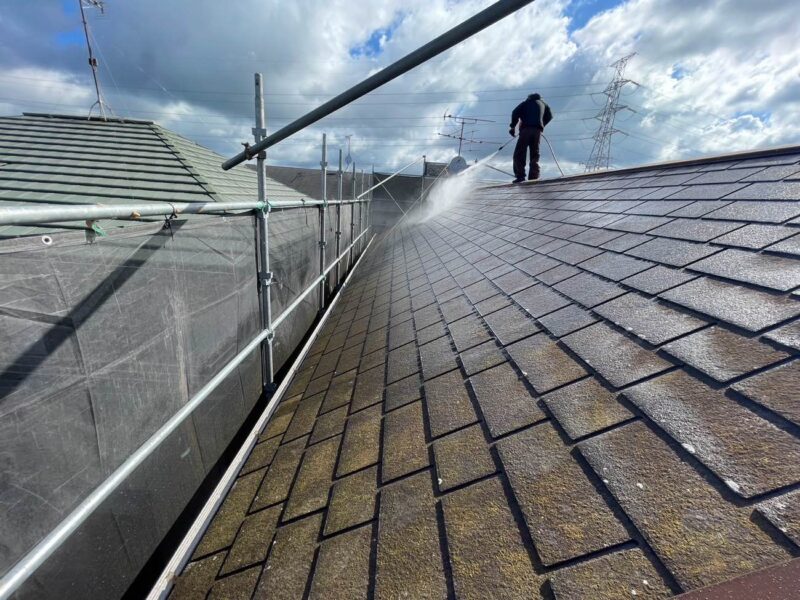 まずはカビや苔を強力な水圧で徹底的に洗い流します。汚れを完全に除去することで、新しく敷く防水シートが既存の屋根にピタリと密着し、不具合を防ぎます。