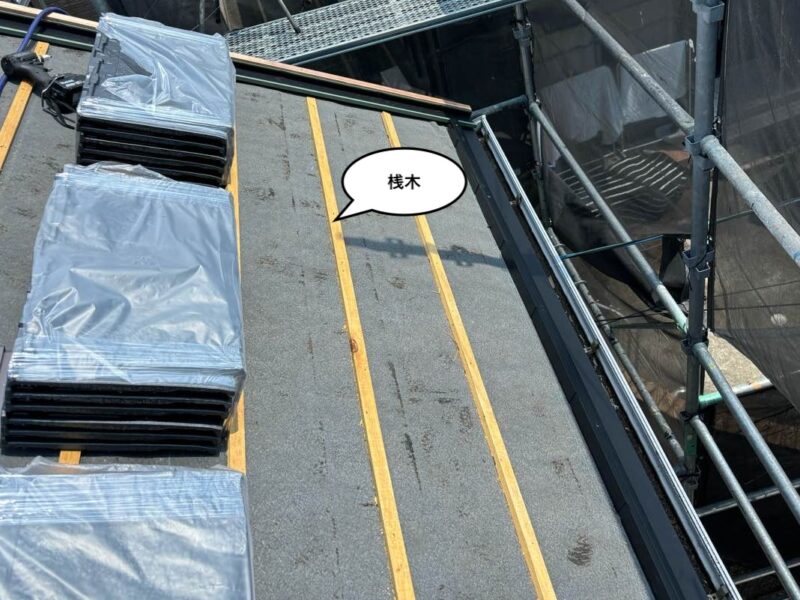 桟木とは、屋根材をビスでしっかりと留めるための下地木材を指します。